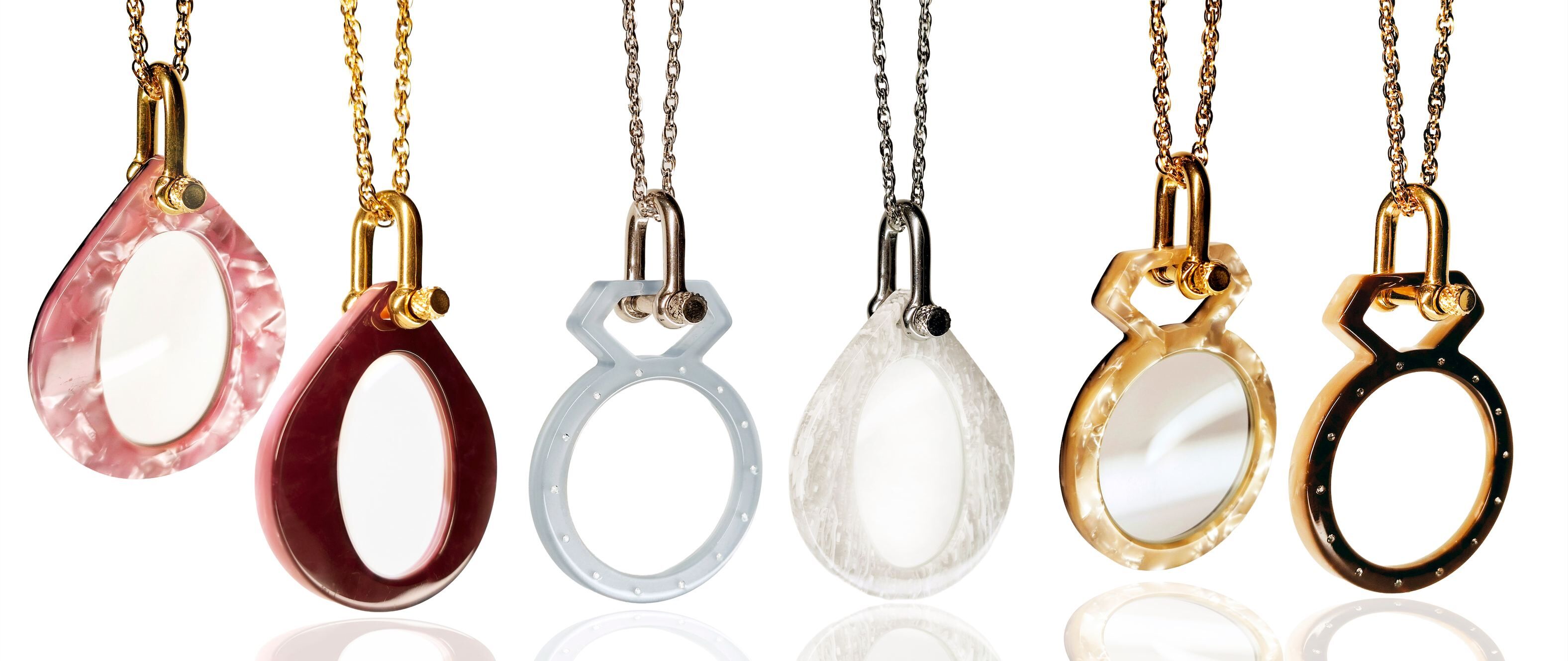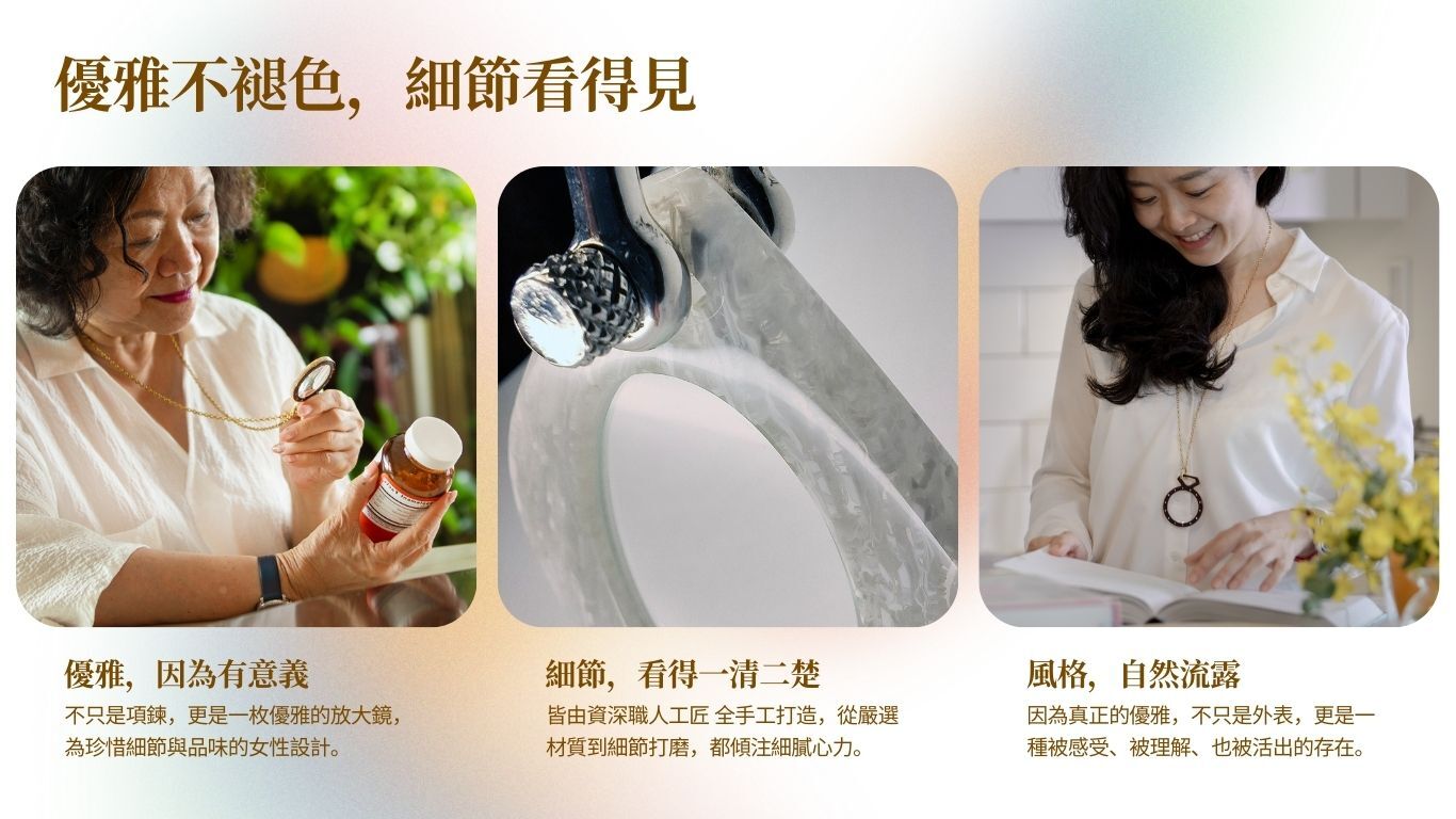 典雅與功能兼具的項鍊,中間鑲崁放大鏡片,讓您在有需要時,優雅從容的看清每個細節。